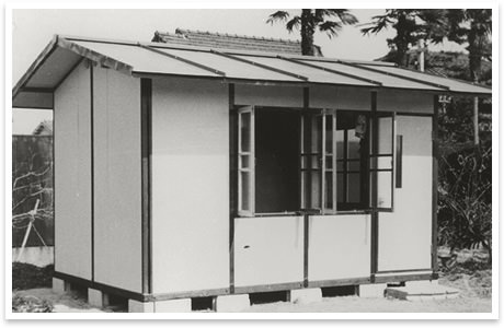 当時の住宅は新築も増築も「木造」の「請負」で建てるのが常識、「鉄骨プレハブ建築」は常識外れ。試行錯誤を重ね、ついに「ミゼットハウス」が誕生する。当時、建築材料として流通し始めた軽量形鋼と、オイルテンパー(油を浸透させて加熱処理)したハードボードを使ったパネル工法を採用、3坪以下に抑えることで建築確認を不要にし、工場で作ったらすぐトラックに積んで工事現場へ届けられるようにした。