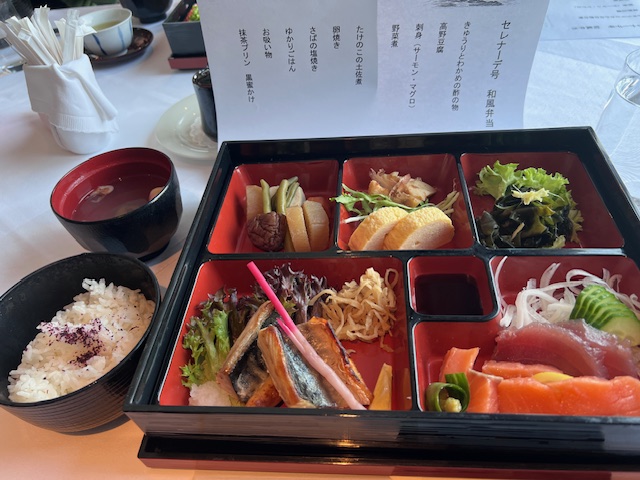 デザートは抹茶プリン。寄港するたびに料理長が刺身や豆腐を調達に走るという。